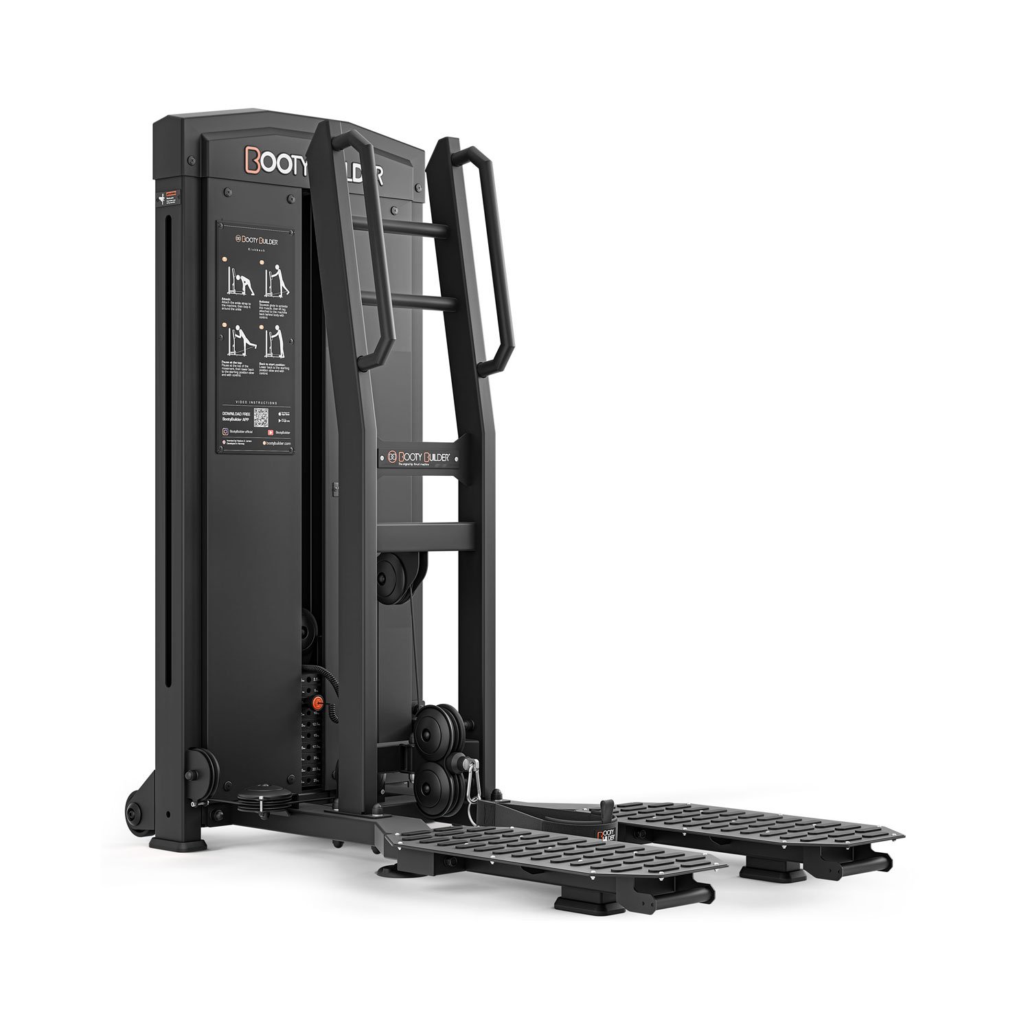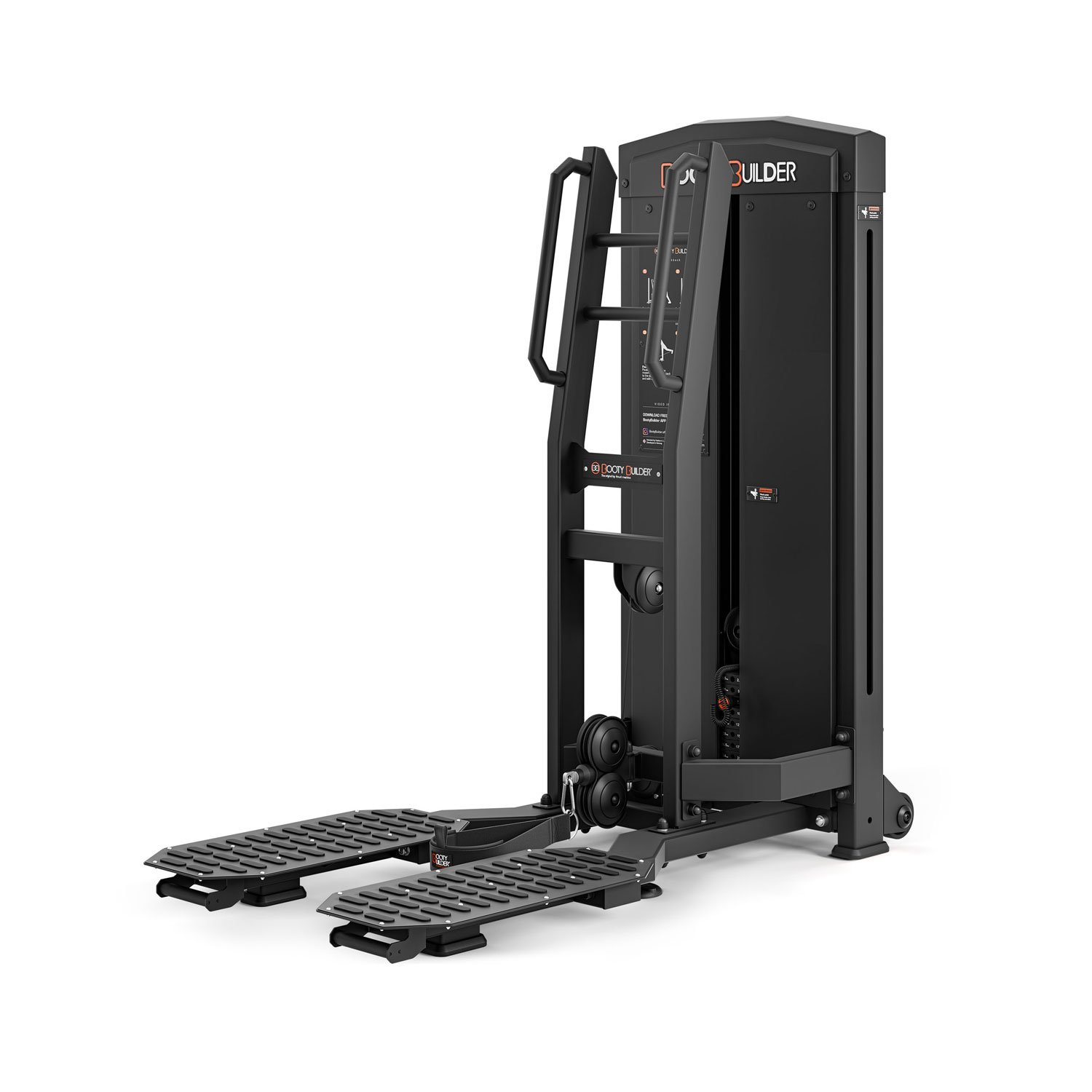 Our new Selectorized Kick Back Machine features a 110LB / 50KG weight stack for quick and easy weight changes. The raised foot platform allows you to swing your leg without your foot hitting the floor.