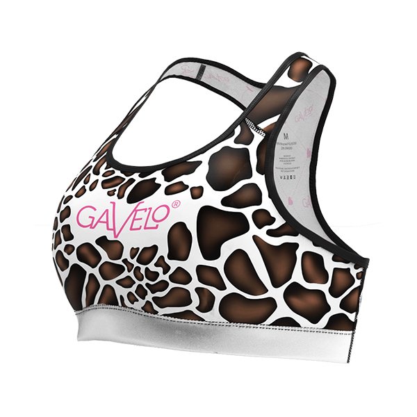 Brown/black spot on white fabric. Gavelo logo in pink on the chest.