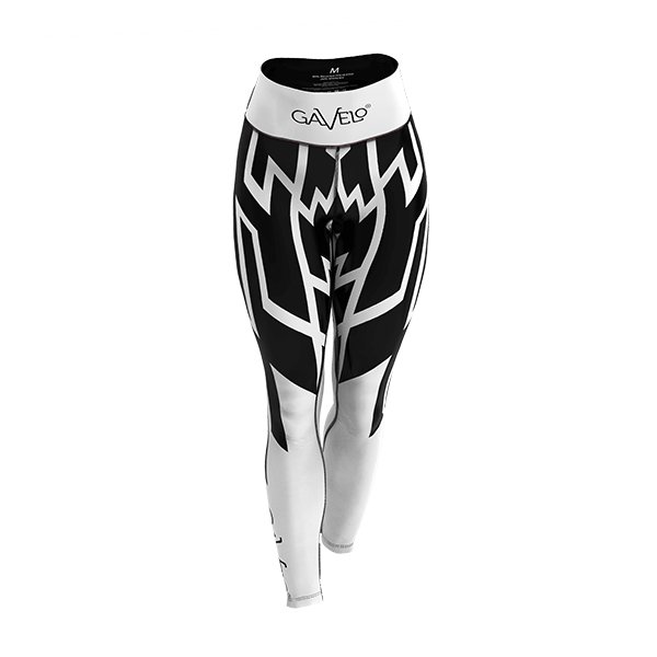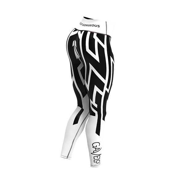 This graphic model looks stunning with both bright and dark tops and/or gear. The logo is black on the white base of the right calf and matches the white base of the waist with black text ”GAVELO GORGEOUS”Fit