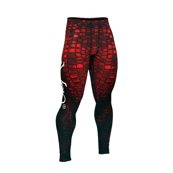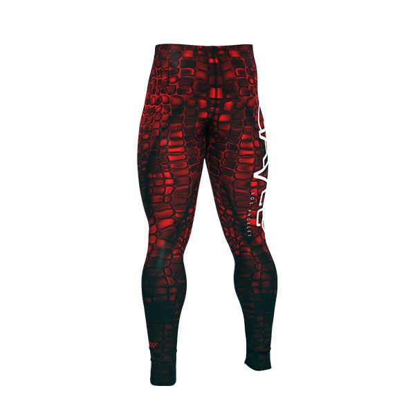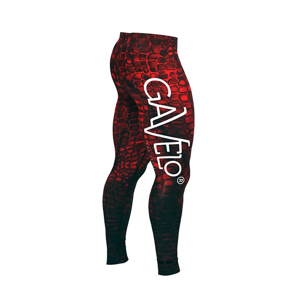 A pattern with inspiration from both of a lizards skin as well as superheroes. The black and red pattern bleeds out in to black on the shins. Gavelo logo in white on the right thigh. Perfect for wearing with shorts.