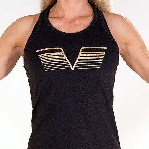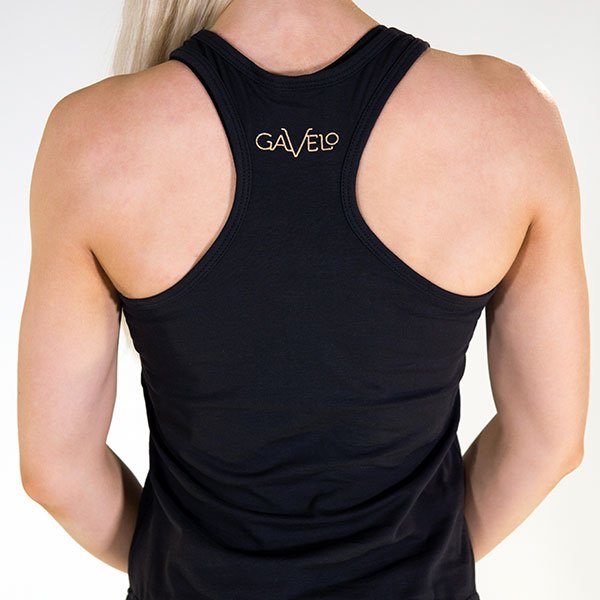 Stylish black tank with Gavelo Victory vings in gold on the chest.Normal in size.WASHING INSTRUCTIONS