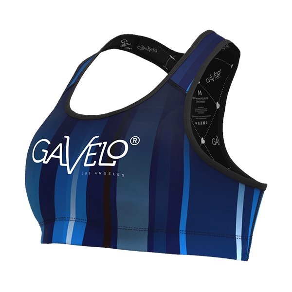 Medium support. The racerback design allows full range of motion. This Sports Bra is made with a 73% rPET and a 27% Lycra blend. The rPET is polyester made out of recycled PET-bottles. The Lycra is in the blend to give the fabric its comfortable stretch. UPF 50 sun protection. A nice and decorative lining, that makes for good breathability. A variation of blue stripes goes from the top to the bottom. Gavelo logo in white on the chest.