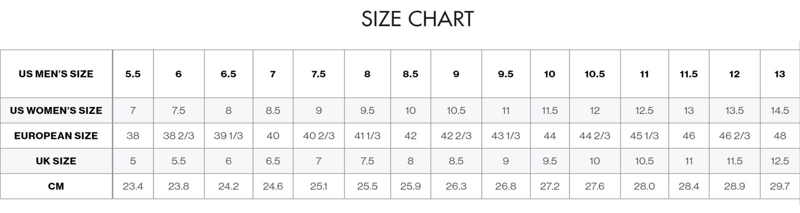 44 (UK 9,5 ; 27,2cm), 44 2/3 (UK 10 ; 27,6cm), 45 1/3 (UK 10,5 ; 28cm), 46 (UK 11 ; 28,4cm), 46 2/3 (UK 11,5 ; 28,9cm), 48 (UK 12,5 ; 29,7 cm)